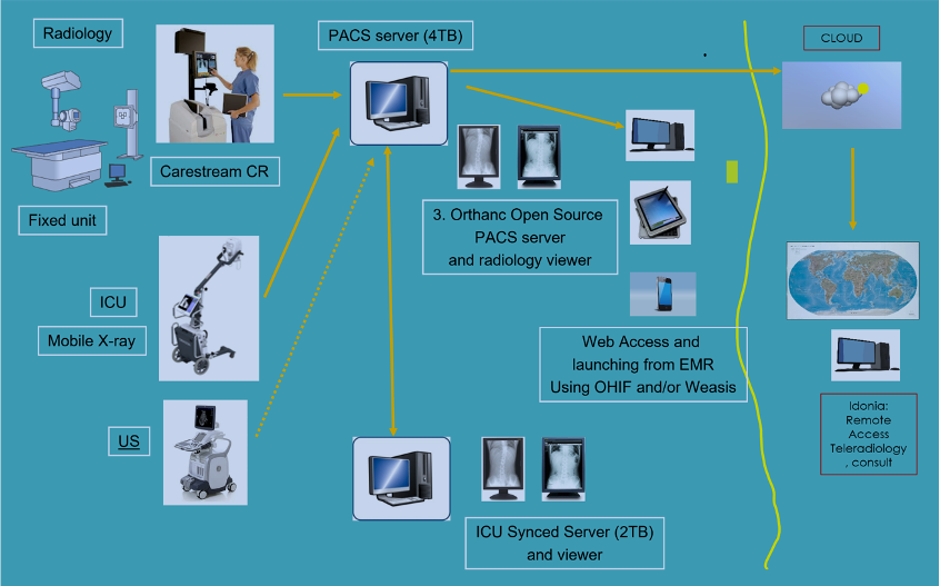 We found a used fixed X-ray table and wall stand, along with a Carestream CR, in NYC at a defunct clinic, and purchased a new portable X-ray with a digital plate. The site already had a used Ultrasound. An open-source PACS (Orthanc) was chosen for its ease of installation and because this is a relatively small institution that should be served by this configuration. There are two instances of the PACS, both on separate desktop servers that were custom-built and shipped from the US. One has a 4TB capacity, and the secondary has a 2TB capacity, which should provide at least 5 years of storage. A script was created that syncs both PACS systems, and using web viewers (Osimis or OHIF), one can access either system if one happens to go down. One server was installed inside the radiology reading room, the other one in the ICU. Software donated from Idonia allows for uploading images to the cloud for a second opinion.
